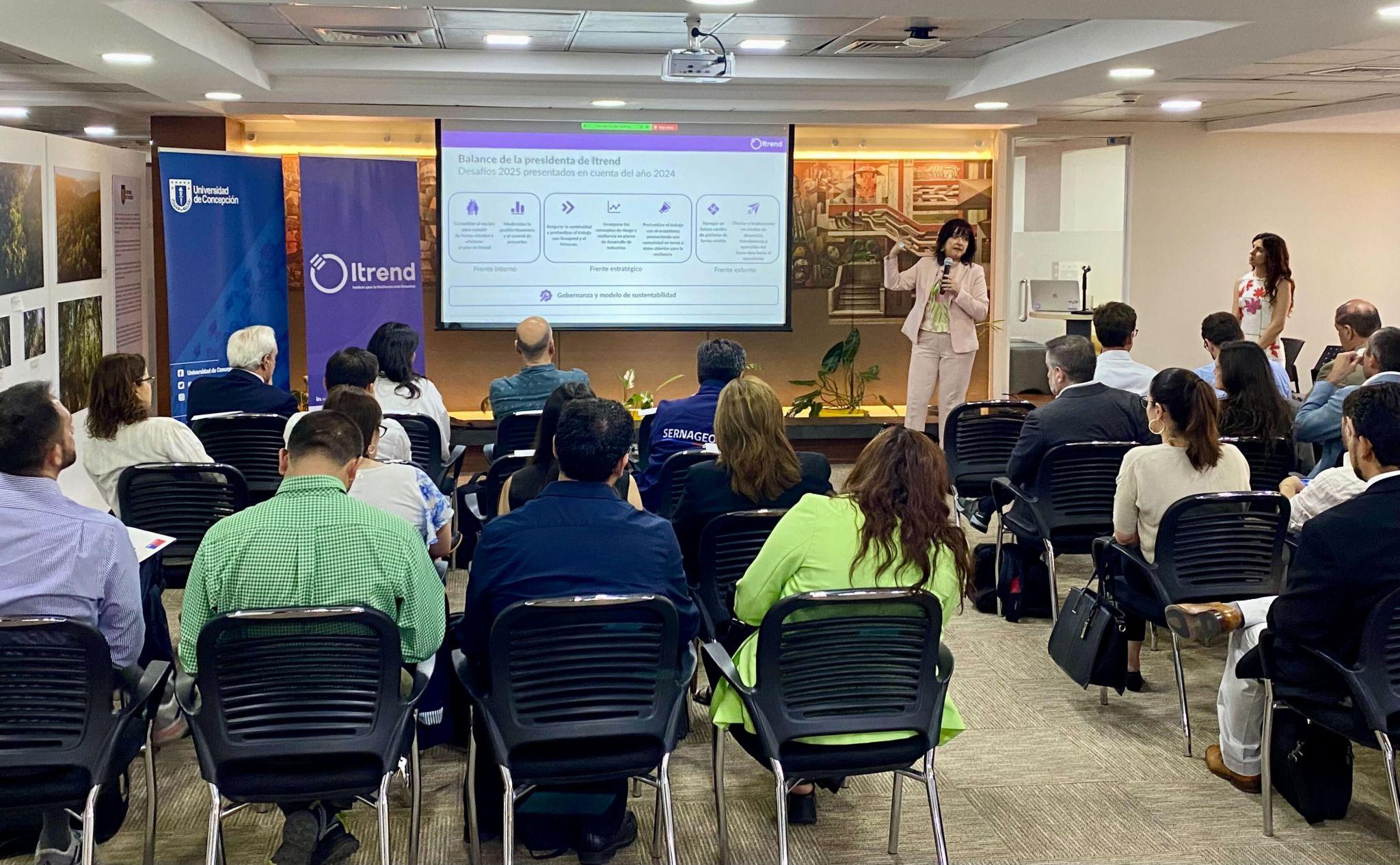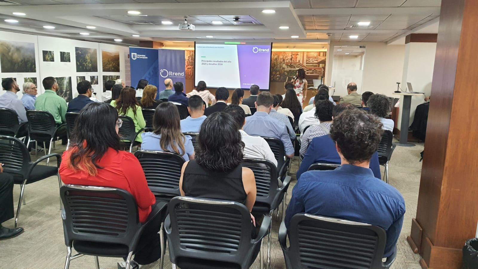Este martes 13 de enero se realizó en UdeC Santiago el directorio ampliado del Instituto para la Resiliencia ante Desastres (Itrend Chile), instancia en la que se presentaron los proyectos, avances y logros, junto con los principales desafíos para 2026. El encuentro fue liderado por la presidenta del directorio, Marcela Angulo, y la directora ejecutiva de Itrend, Catalina Fortuño, y contó con la participación de representantes del sector público, la industria, la academia y la sociedad civil, incluyendo miembros de los Consejos de la Sociedad Civil y de Organismos Públicos, el Comité Académico y otros integrantes de la gobernanza del instituto.